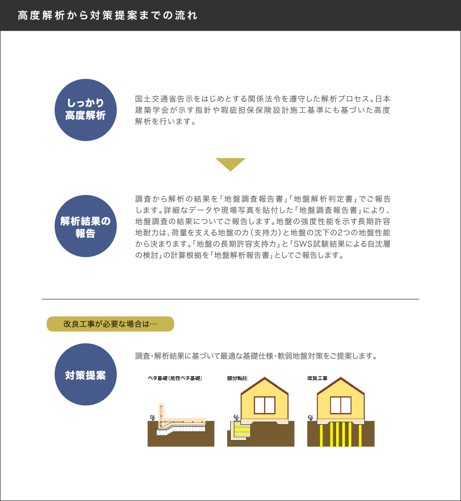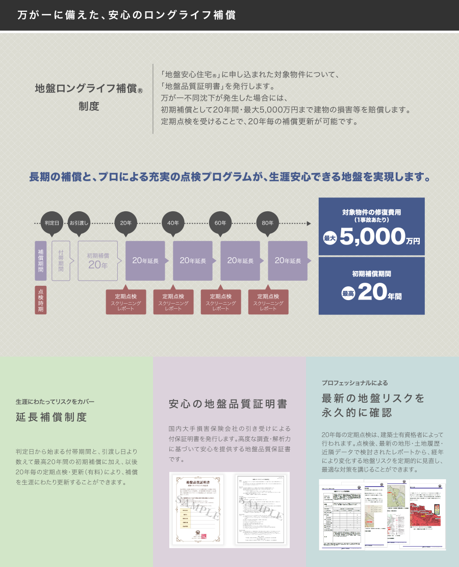 東日本大震災以降、多くの大規模地震が頻発する昨今、 住まいの安全性への関心はますます高まっています。 建物の強度を測る上で構造が注目されがちですが、 その強度を支えているのは基礎である地盤です。 スマートハウジングでは、建物はもちろん、地盤にもこだわっています。 お客様に安心して永く住んでいただくために 第三者機関による客観的な評価と補償を得ることで、 さらに確実なものにしてご提供しています。