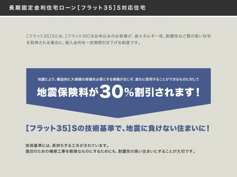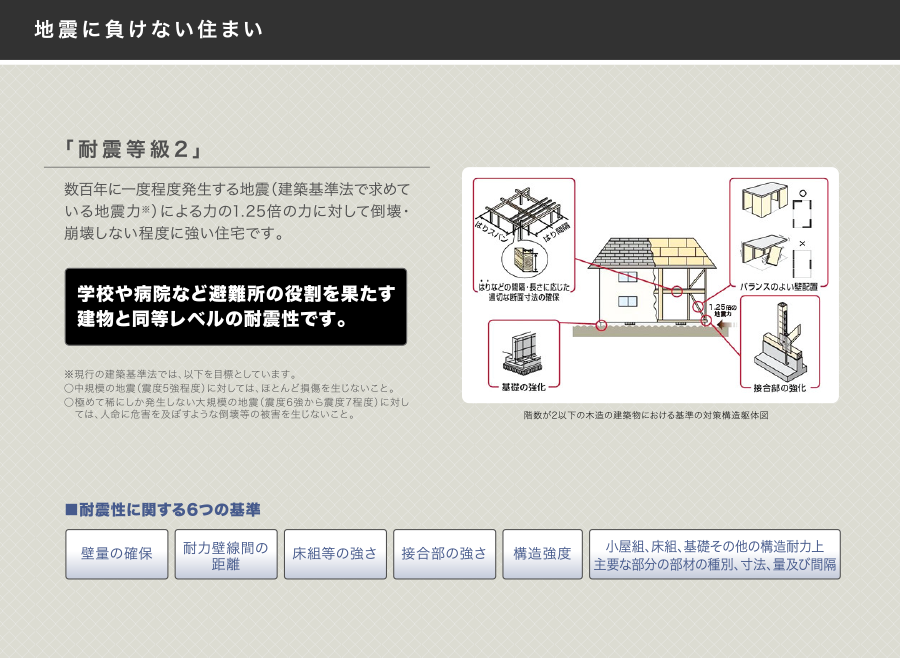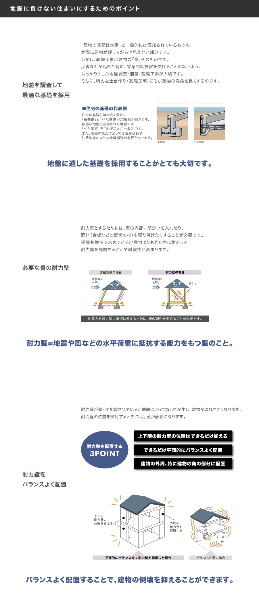 昨今、日本各地で大きな地震がたくさん起きています。 世界レベルで見ても、此処日本は地震大国と言えるでしょう。 地震が発生したときに家が倒壊したり、損傷しないようにしなければなりません。 工法や立地などに合わせて、十分な耐震性能を確保し、 復旧のための補修工事を軽微なものにするためにも、耐震性・耐久性の高い住まいにすることが大切です。 スマートハウジングで建築する建物は、 それらを踏まえ、一定基準をクリアした住宅性能の優れた建物になっております。