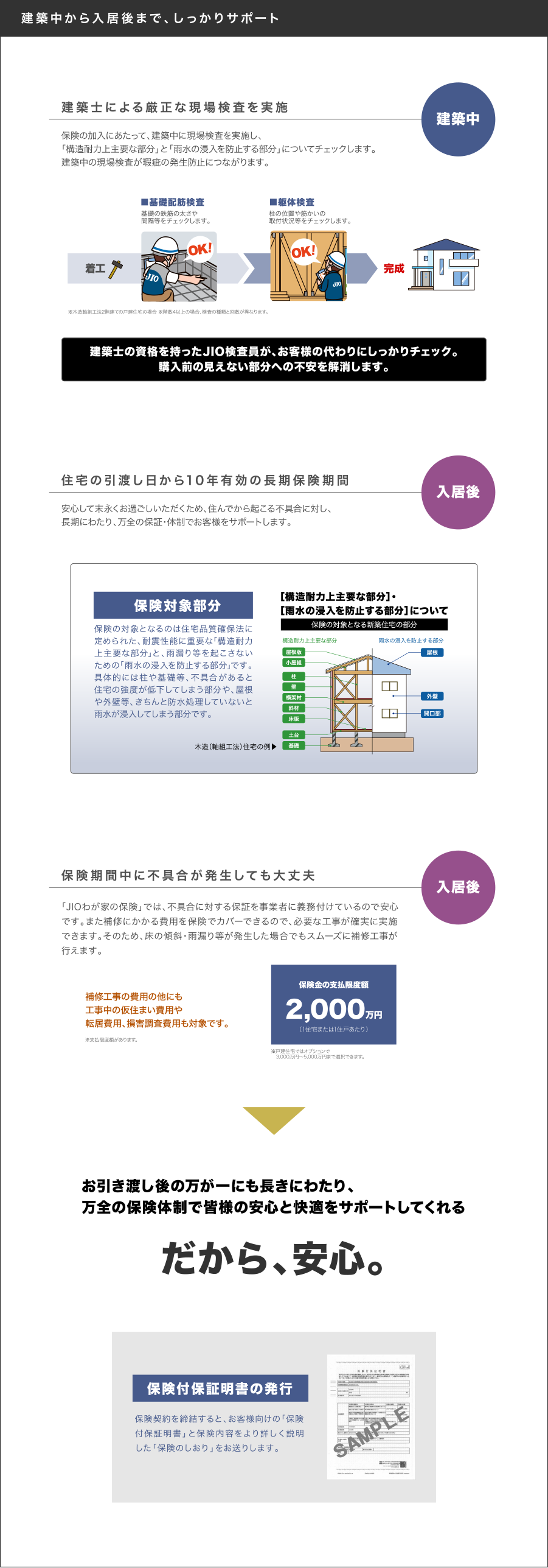 住宅のご購入にあたり、 目で確認できない部分や入居後の不安を解消していただくため、 建築中のチェックから入居後のサポートまで、 第三者機関を通じ、万全の体制でお客様を支えます。 「JIOわが家の保険」は、住宅瑕疵担保履行法に基づく新築住宅の保険として 株式会社日本住宅保証検査機構(JIO)が提供するものです。 スマートハウジングは、お客様に末永く快適に過ごしていただくことを第一に考えています。